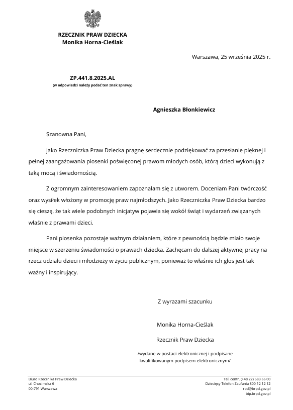 Niedawno otrzymaliśmy wspaniałą wiadomość z Biura Rzecznik Praw Dziecka, pani Moniki Horna-Cieślak, która z zainteresowaniem wysłuchała naszej piosenki o prawach dziecka i z wielką życzliwością doceniła naszą pracę!
